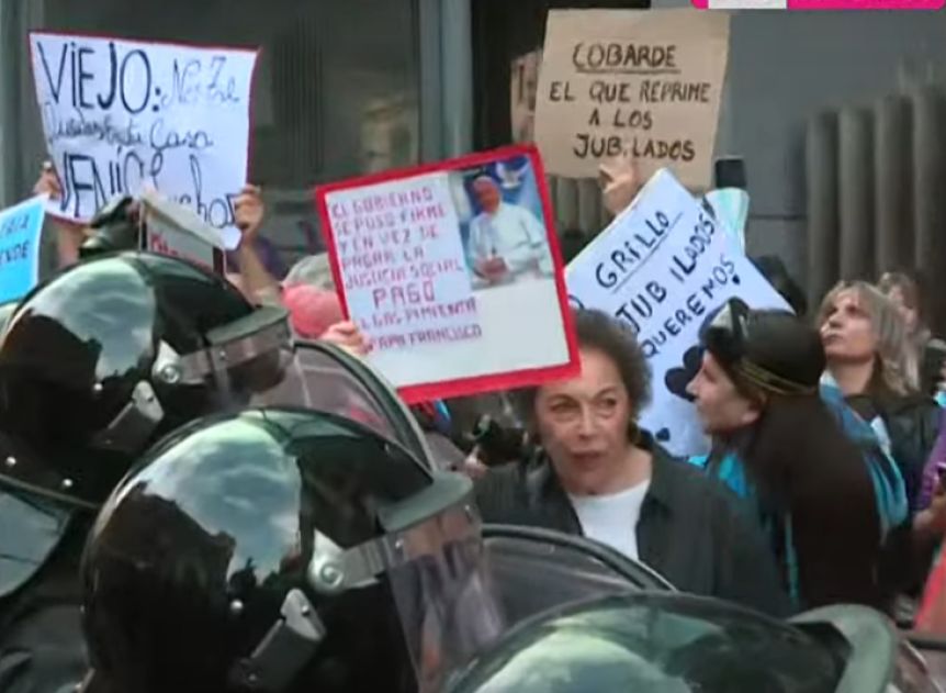 Los uniformados también arrojaron gas pimienta contra los manifestantes, que además de jubilados eran personas de distintas organizaciones que se unieron a la movilización para apoyarlos.