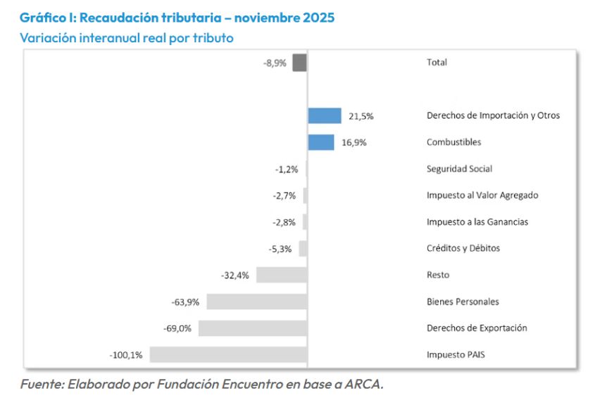 En base a datos oficiales de la Agencia de Recaudación y Control Aduanero (ARCA), los analistas de Encuentro determinaron que en noviembre, la recaudación tributaria total de la Nación registró “un incremento nominal interanual del 19,7% pero una caída real del 8,9%” debido al efecto de la inflación, con el impuesto a los combustibles y los derechos de importación y afines como los únicos dos rubros que tuvieron subas en términos reales.