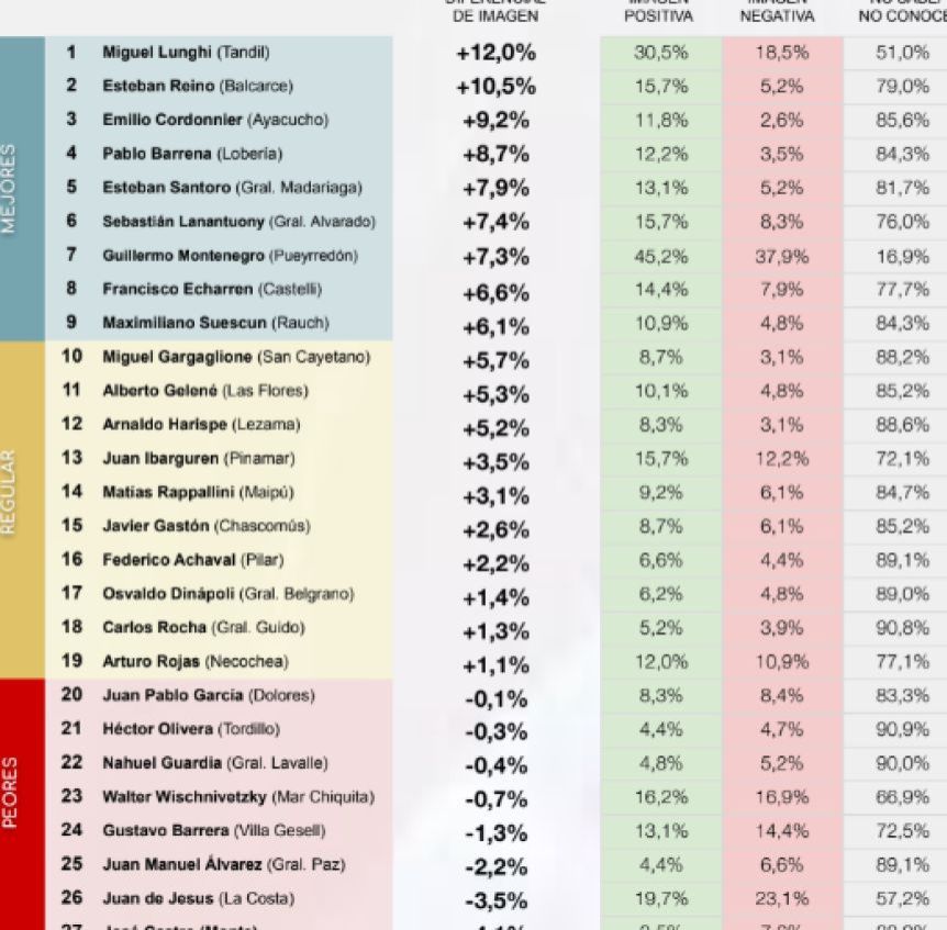 ¿Cómo quedó la Quinta Sección? Los primeros cinco lugares del ranking -que ordena por el balance entre imagen positiva y negativa- quedaron para los alcaldes de la UCR. Miguel Ángel Lunghi, de Tandil, encabezó la nómina con un saldo de 12% a favor. Le siguieron Reino (Balcarce), Cordonnier (Ayacucho), Barrena (Lobería) y Santoro (Madariaga). Recién el sexto puesto es para un alcalde de Unión por la Patria: el massista Sebastián Lanantuony que conduce General Alvarado.