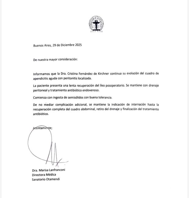 El comunicado también remarca que, hasta el momento, Cristina Kirchner no presenta fiebre y continúa bajo observación permanente. De no mediar complicaciones adicionales, la indicación médica es sostener la internación hasta la recuperación total del cuadro abdominal, el retiro del drenaje y la finalización del tratamiento antibiótico.