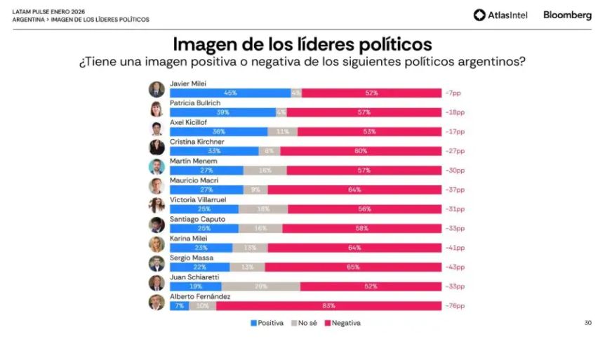 El clima político argentino atraviesa un momento de fuerte tensión, según la edición de enero de 2026 de Latam Pulse, la iniciativa conjunta de AtlasIntel y Bloomberg. El estudio traza una radiografía marcada por el desgaste del gobierno nacional, un malestar económico persistente y una creciente fragmentación del escenario político.