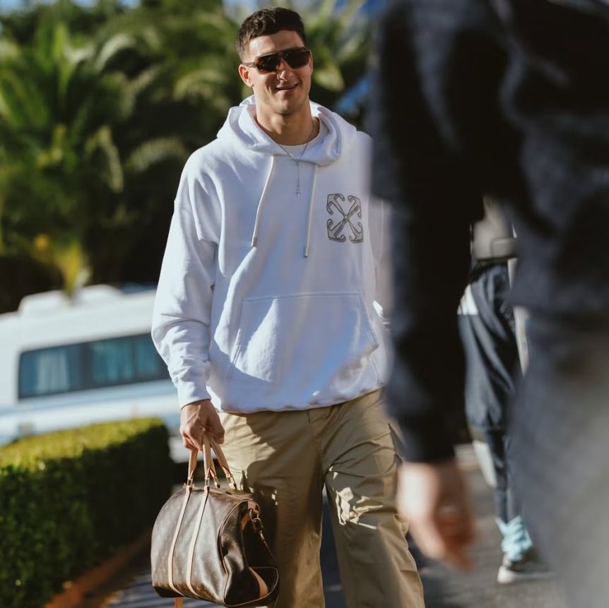 Leandro Paredes también sumó a la tendencia con un blazer verde oscuro arremangado sobre una remera negra de cuello amplio y un bolso Louis Vuitton. Nahuel Molina optó por un total black con zapatillas contrastantes, mientras que Juan Musso lució un buzo blanco amplio y gafas de sol. Valentín Barco y Joaquín Panichelli, recién llegados desde Francia, coincidieron en looks oscuros y elegantes.