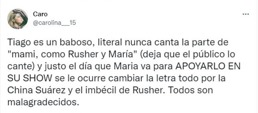 Ya lo veo a tiago cambiándole el nombre a la letra cuando rusher corte con la china, q pelotudez eso de meter parejas en las canciones 🙄