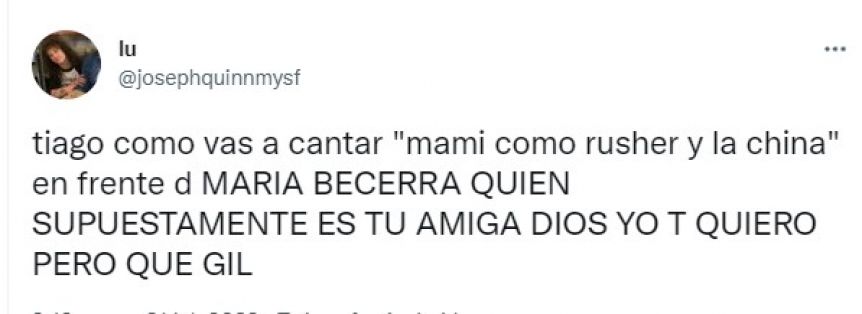 Me encanta que Tiago haya cambiado el "Mami como Rusher y María" por "Mami como Rusher y la China" porque literalmente podría haberlo dejado igual sin hacerse drama porque la China se llama María Eugenia JDSAJKDASJKD