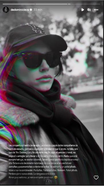 "Esta es una decisión tomada luego de que me sacaran una foto en pantuflas y pasamontañas sosteniendo bolsas de Walmart y un pañal pillado. Volvé a leer la combinación: pantuflas. Pasamontaña. Walmart. Pañal pillado", añadió Eva. Y con su humor característico señaló: "Perdono pero nunca olvido. La venganza será divina. Abran paso, señores, ya van a ver quién puedo ser".