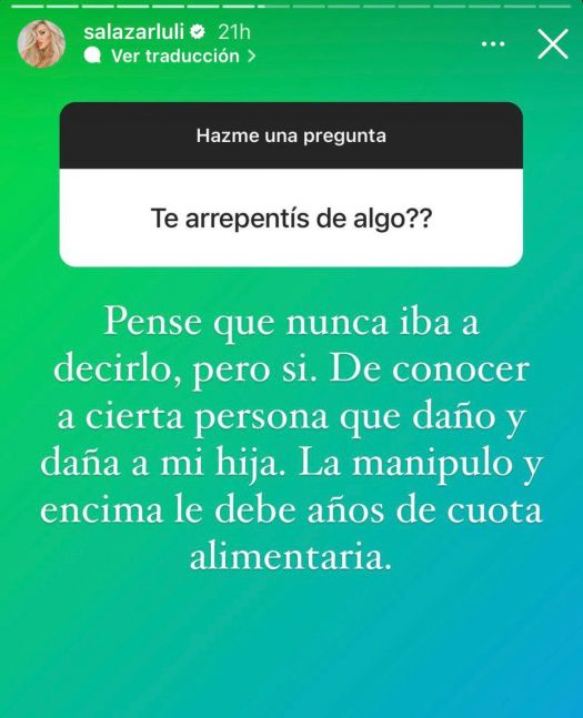 A su vez, encontró una nueva oportunidad para apuntar contra de Martín Redrado, aunque sin nombrarlo directamente. "¿Te arrepentís de algo?" le dijeron, "pensé que nunca iba a decirlo, pero si. De conocer a cierta persona que daño y daña a mi hija. La manipuló y encima le debe años de cuota alimentaria" contestó contundente.