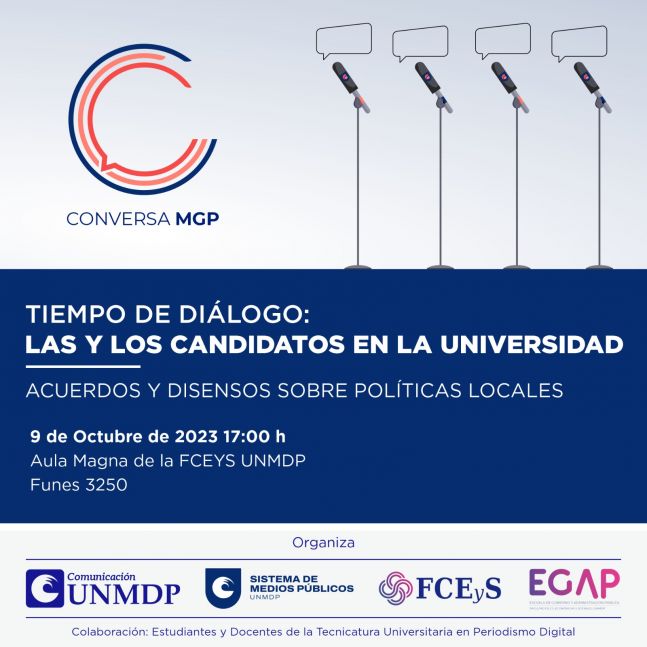 Además, en la Universidad Nacional de Mar del Plata se llevarán a cabo dos encuentros entre los candidatos. El 6 de octubre, tendrá lugar uno en el Aula Magna de la Facultad de Humanidades, moderado por la docente Cecilia Ballesteros. El otro encuentro se realizará el 9 de octubre a las 17, en la Facultad de Ciencias Económicas y Sociales, en su aula magna, y será transmitido por el Canal Universidad.