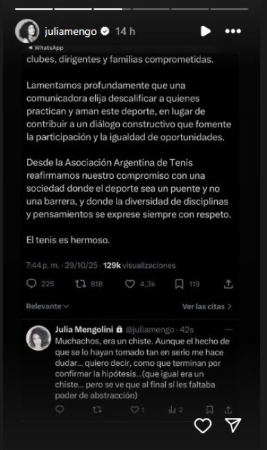 La Asociación Argentina de Tenis manifiesta su enérgico repudio a los dichos vertidos por la periodista Julia Mengolini, quien en una reciente intervención pública afirmó que “para ser tenista hay que ser tonto”, una expresión que consideramos ofensiva, estigmatizante y contraria…