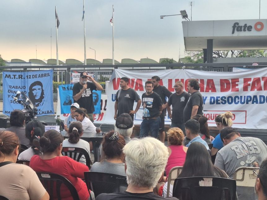 Frente a la planta de FATE, que permanece tomada por sus trabajadores, hubo una charla debate con organizaciones sociales, de la que participaron dirigentes como Eduardo Belliboni, del Polo Obrero, y representantes del Sindicato Único de Trabajadores del Neumático Argentino (SUTNA), que motorizan el reclamo de los trabajadores desvinculados.