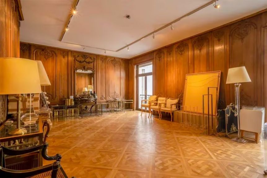 La propiedad también cuenta con una biblioteca totalmente revestida con elegantísima boiserie, un gimnasio y un amplio sector de servicios. Como el edificio fue construido hace unos 60 años, no era habitual que se incluyeran amenities. Sin embargo, la vivienda que habitó Amalita cuenta con piscina, gimnasio y otras áreas sociales.
