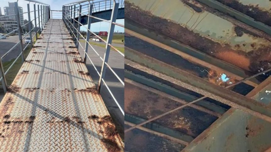 Las pasarelas cruzan la Av. de los Trabajadores, una calle muy transitada, y son el único acceso para llegar a los balnearios de la zona, al Parque Ambiental y a las paradas de colectivos orientadas hacia el centro de la ciudad. Los puentes muestran un deterioro avanzado con hierros oxidados, barandas rotas y agujeros en el piso.