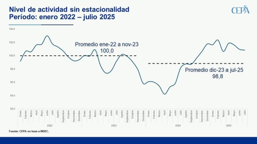 “En julio, la actividad económica registró una caída de 0,1% respecto a junio consolidando un nivel inferior a dic/24. Venía de caer 0,6% en junio y 0,2% en mayo”, observó el CEPA.
