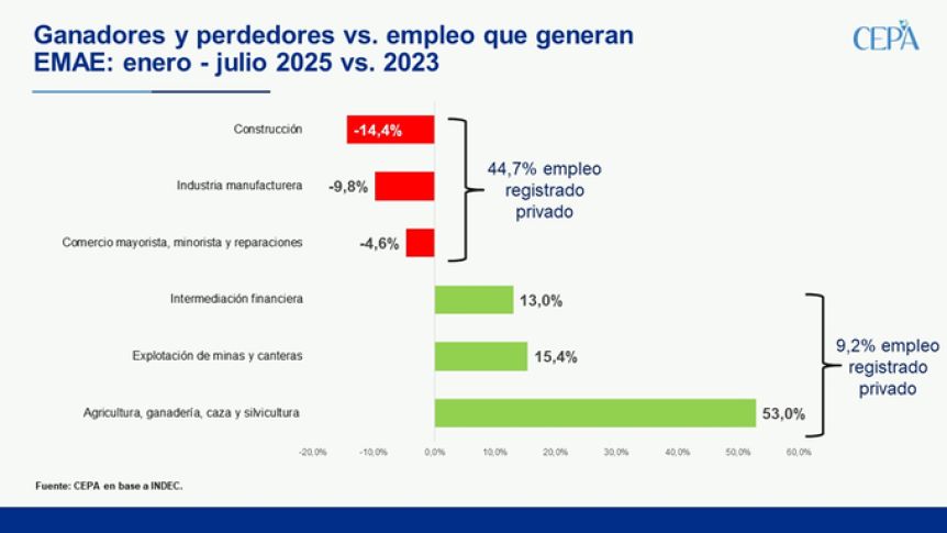 “Los sectores que impulsan la actividad económica —al comparar el promedio de los primeros siete meses de 2025 con el mismo período de 2023— concentran apenas el 9,2% del empleo registrado privado”, abundó el CEPA en su análisis. “Dentro de ellos, el agro representa el 5,3% y su crecimiento se explica, en gran parte, por la comparación con un 2023 particularmente malo afectado por la sequía. En cambio, los sectores que perdieron participación en el estimador mensual de actividad económica (EMAE) explican el 44,7% del empleo privado registrado.”