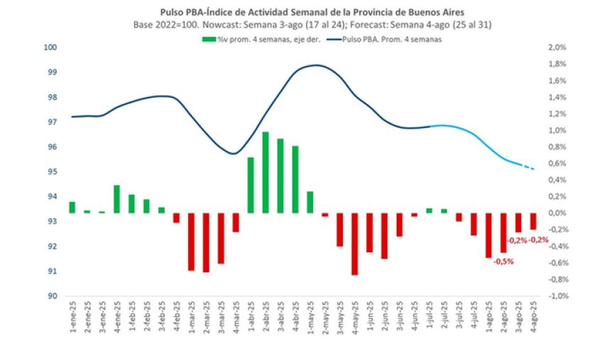 “Pulso PBA, indicador temprano de la actividad económica de la provincia de Buenos Aires elaborado por el Banco Provincia, registró en agosto una caída mensual del 1,4%”, señaló.