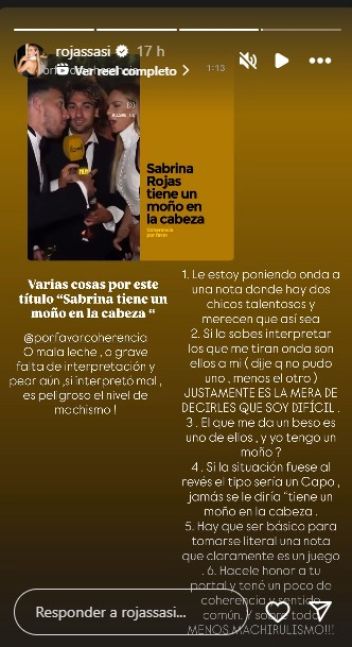 “Varias cosas por este título ‘Sabrina tiene un moño en la cabeza’”, escribió junto al reel en cuestión. Sin dudarlo, arrobó al medio y cuestionó: “O mala leche, o grave falta de interpretación y peor aún, si interpretó mal, es peligroso el nivel de machismo”.