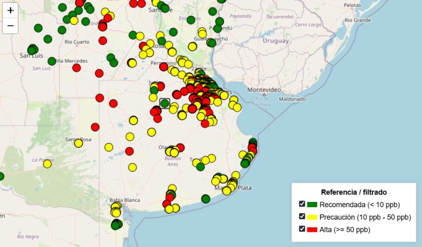 Actualmente, el Mapa de Arsénico muestra que en la provincia de Buenos Aires hay 15 municipios con círculos en rojo, y más de una veintena con color amarillo.