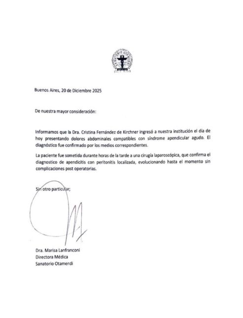 La expresidenta Cristina Fernández de Kirchner fue internada de urgencia este sábado 20 de diciembre en el Sanatorio Otamendi tras presentar fuertes dolores abdominales. Luego de realizarle los estudios correspondientes, los médicos determinaron que debía ser intervenida quirúrgicamente y fue operada mediante laparoscopía por un cuadro de apendicitis con peritonitis localizada.