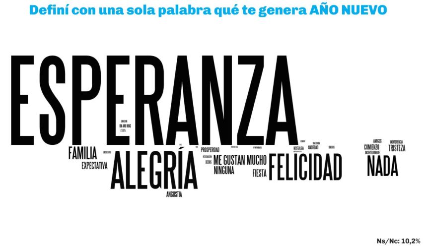 En cuanto al Año Nuevo, la idea que aparece con una abrumadora mayoría es la esperanza. Los encuestados también relacionan esta festividad con conceptos como “alegría” y “felicidad”, y en menor medida con “nada”, pero la primacía de “esperanza” es absoluta.