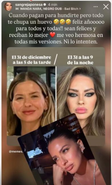 La mujer tomó esta situación como parte de una campaña en su contra realizada por Wanda Nara y salió a defender su buen nombre. Asimismo redactó "Cuando pagan para hundirte pero todo te chupa un huevo. ¡Feliz añoooo para todos y todas! Sean felices y reciban lo mejor. Me veo hermosa en todas mis versiones. Ni lo intenten". Sin embargo, se arrepintió enseguida porque borró la historia de Instagram.