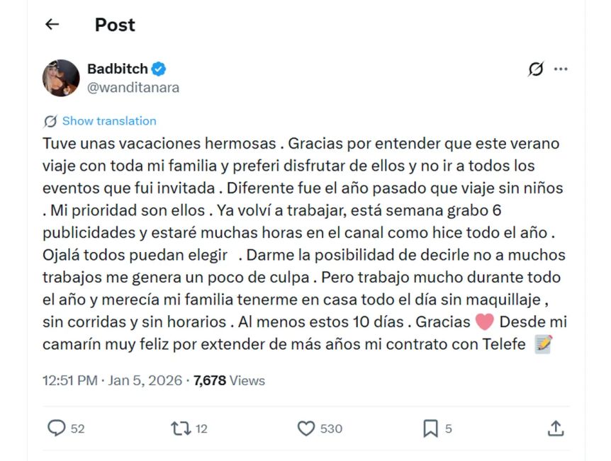 De esta manera, ni lerda ni perezosa, la conductora hizo un descargo en sus redes sociales donde aclaró cómo eran los hechos: "Tuve unas vacaciones hermosas. Gracias por entender que este verano viajé con toda mi familia y preferí disfrutar de ellos y no ir a todos los eventos que fui invitada". Luego continuó: "Diferente fue el año pasado que viajé sin niños. Mi prioridad son ellos. Ya volví a trabajar. Esta semana grabo seis publicidades y estaré muchas horas en el canal, como hice todo el año. Ojalá todos puedan elegir".