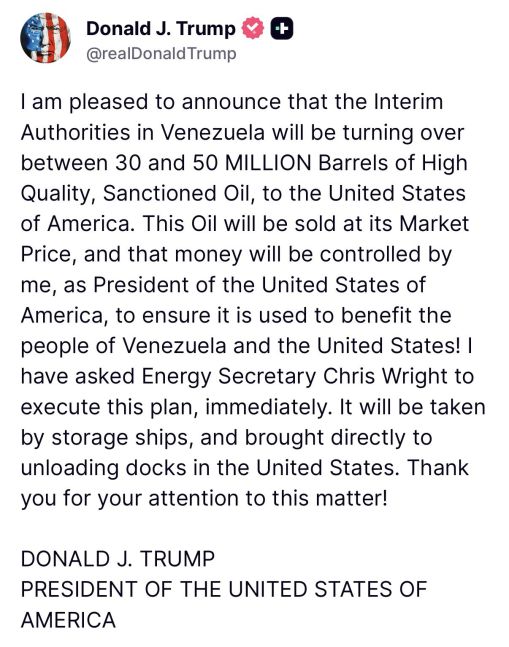 “Me complace anunciar que las autoridades provisionales de Venezuela entregarán entre 30 y 50 millones de barriles de petróleo de alta calidad y autorizado a Estados Unidos. Este petróleo se venderá a precio de mercado y yo, como presidente, controlaré ese dinero para garantizar que se utilice en beneficio del pueblo venezolano y de Estados Unidos”, expresó Trump en su cuenta de la plataforma Truth Social.