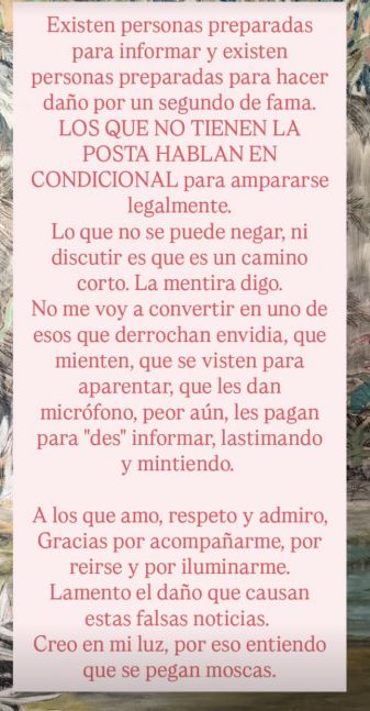Viale también agradeció el apoyo de su círculo íntimo y cerró con un mensaje de autoconfianza: “A los que amo, respeto y admiro, gracias por acompañarme, por reírse e iluminarme. Lamento el daño que causan estas noticias falsas. Creo en mi luz, por eso entiendo que se pegan moscas”.