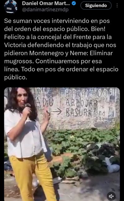 Pero el ex funcionario de Seguridad fue más allá. En una publicación que no pasó desapercibida en el Concejo, lanzó una felicitación cargada de sarcasmo: “Felicito a la concejal del Frente para la Victoria defendiendo el trabajo que nos pidieron Montenegro y Neme: Eliminar mugrosos”.