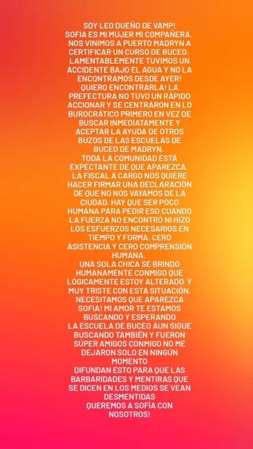 En medio de la angustia, el novio de la joven difundió un mensaje en el que describió lo sucedido como un “accidente bajo el agua” y aseguró que la pérdida de contacto se produjo durante la práctica de buceo. Además expresó su desesperación por la falta de novedades y pidió que la búsqueda continúe sin pausas, destacando el compromiso de los rescatistas.