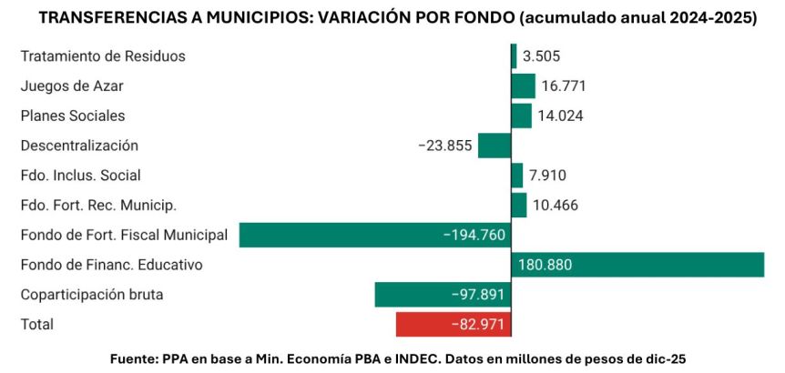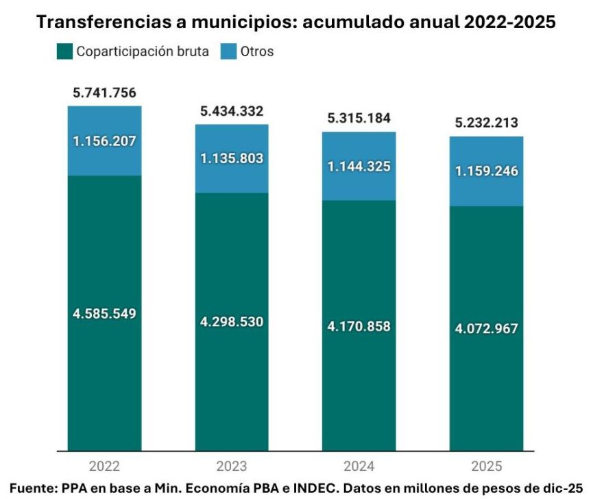 En pesos de diciembre de 2025, los montos totales girados a los municipios cayeron de 5,741 a 5,232 billones, según el trabajo de PPA en base a datos oficiales. “La dinámica anual evidencia tres descensos consecutivos: –5,4% en 2023, –2,2% en 2024 y –1,6% en 2025”, precisa el informe.