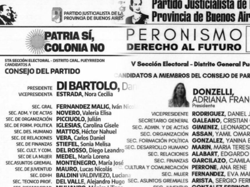 Por un lado competirá la lista 4 (azul), identificada con el lema “Patria sí, colonia no”, que postula como candidato a presidente del PJ local a Daniel Di Bartolo. Este espacio cuenta con el respaldo del kirchnerismo y de La Cámpora.