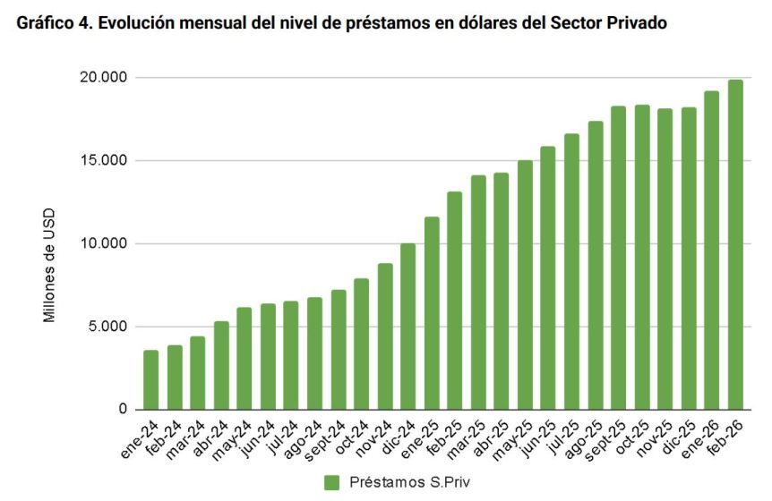 El trabajo advierte que los depósitos y préstamos en dólares continúan creciendo y que esta expansión “puede generar un circuito de ‘argen-dólares’, donde los depósitos en moneda extranjera se expanden sin respaldo real en reservas” en el Central.