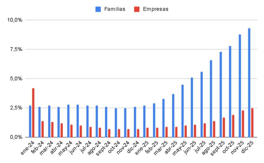 Además, esto se da en un contexto de “morosidad creciente” en los créditos en pesos, que es especialmente fuerte entre las familias, detalla.