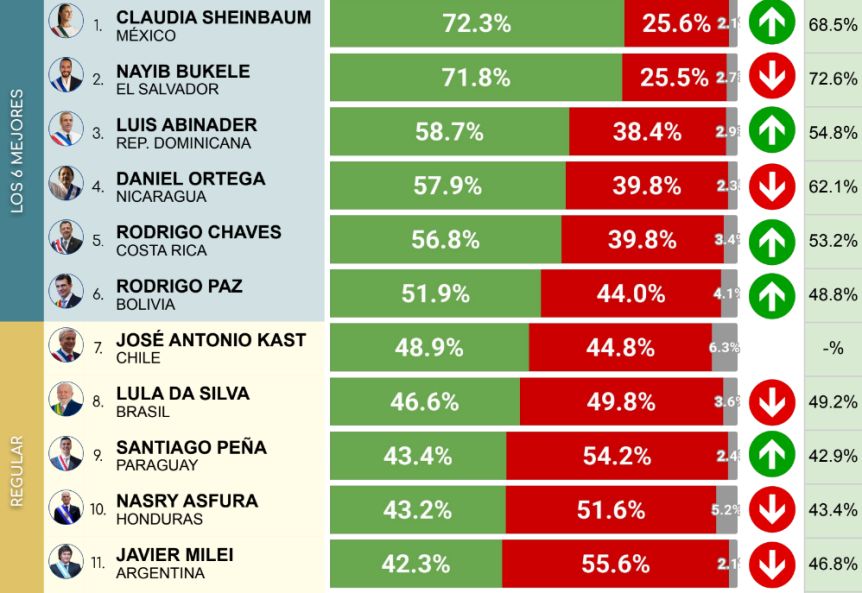 En este momento, en un interesante fenómeno, dos presidentes de características prácticamente opuestas están casi empatados al tope de la lista. Con un 72,3% de imagen positiva y un 25,6% de imagen negativa, la lidera Sheinbaum, de México; le pisa los talones Bukele, de Ecuador, caracterizado por su política de mano dura contra el crimen y su discurso populista de derecha, con un 71,8% de adhesión y un 25,5% de rechazo.