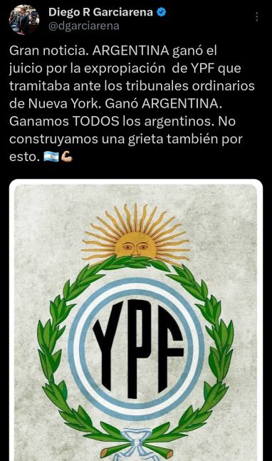 Por su parte, el diputado provincial de la UCR, Diego Garciarena, celebró: “Gran noticia. Argentina ganó el juicio por la expropiación de YPF que tramitaba ante los tribunales ordinarios de Nueva York”.