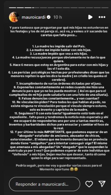 “Y para tantos que preguntan por qué mis hijas no estuvieron en los festejos y los de mi pareja sí, acá va (la explicación), y vamos a ir sacando las caretas que falta poco”, enunció Icardi visiblemente molesto.